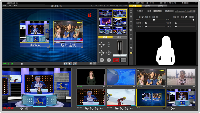 系統(tǒng)中集成了摳像功能、連線功能、燈光效果、倒影及鏡像功能、字幕與臺(tái)標(biāo)功能、幀動(dòng)畫效果制作、導(dǎo)播臺(tái)功能、軌道編輯功能、實(shí)時(shí)錄制與直播功能、虛擬機(jī)位設(shè)置、多個(gè)虛擬屏幕添加等全面的產(chǎn)品功能,實(shí)現(xiàn)眾多高端需求。