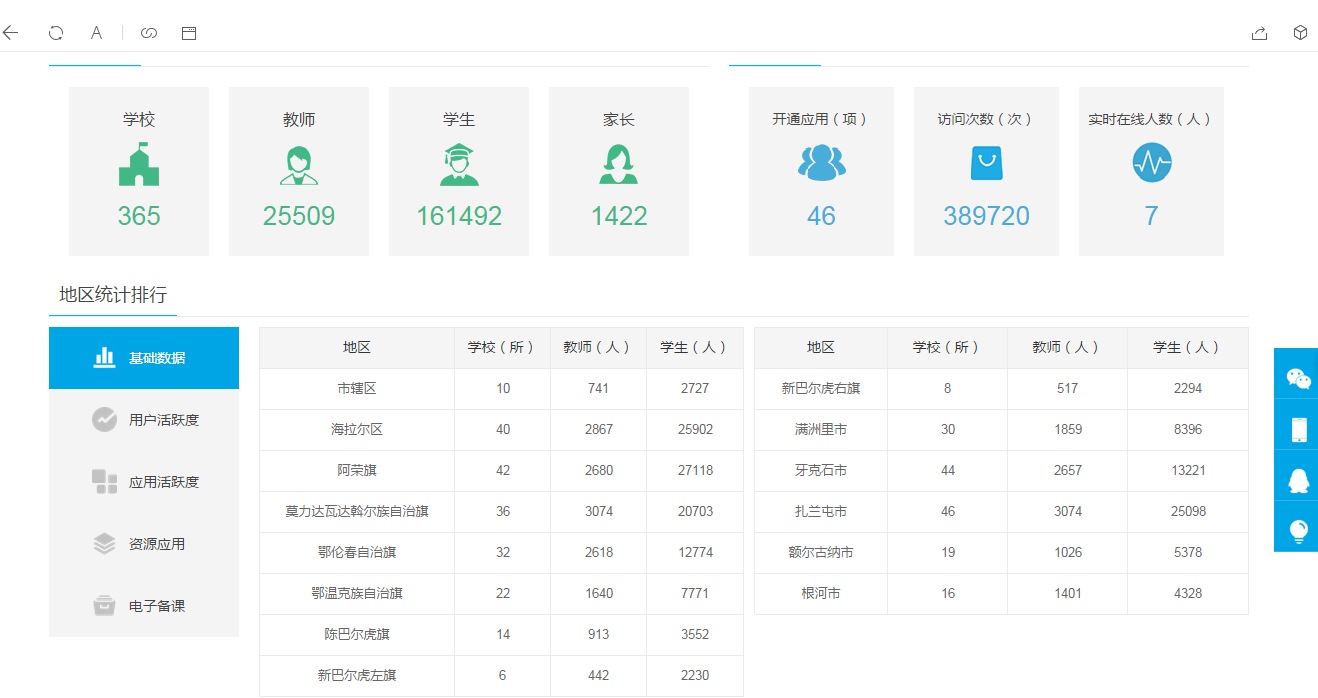 數據統計:支持學??勺远x時間段統計本校設備的使用率和老師的使用時間;支持周期統計(年月周)設備在班級的使用時長、設備告警,媒體推送的次數,資源上傳。